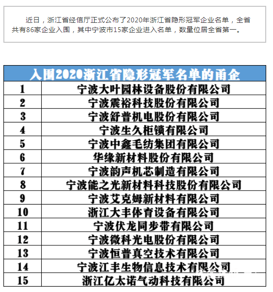 我司属于新材料领域专业,致力于橡胶添加剂新材料研发生产,建有省级研发中心—米兰网站预分散橡胶助剂省级高新技术企业研究开发中心。此次实力成为2020浙江省隐形冠 军一员。
