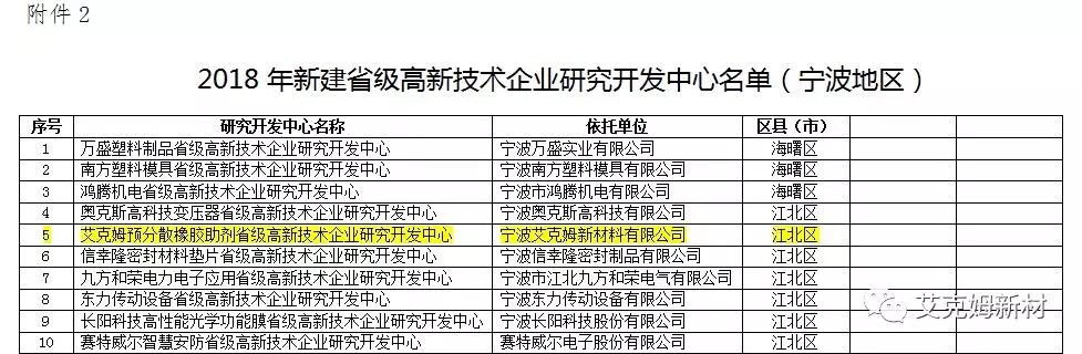 根据《浙江省高新技术企业研究开发中心管理办法》(浙科发条〔2009〕75号)和《浙江省科学技术厅关于组织申报2018年省级高新技术企业研究开发中心的通知》(浙科发条〔2018〕109号)等文件精神,宁波米兰网站新材料有限公司在宁波市科学技术局、江北区科学技术局的大力支持和帮助下,2018年7月我司研究开发中心申请建设“省级高新技术企业研究开发中心”,在区市科技局对辖区内申报的省级高新技术企业研发中心组织开展实地考察、专家评审的基础上,经审查、公示等程序,“米兰网站预分散橡胶助剂省级高新技术企业研究开发中心”已经顺利通过各项审批。